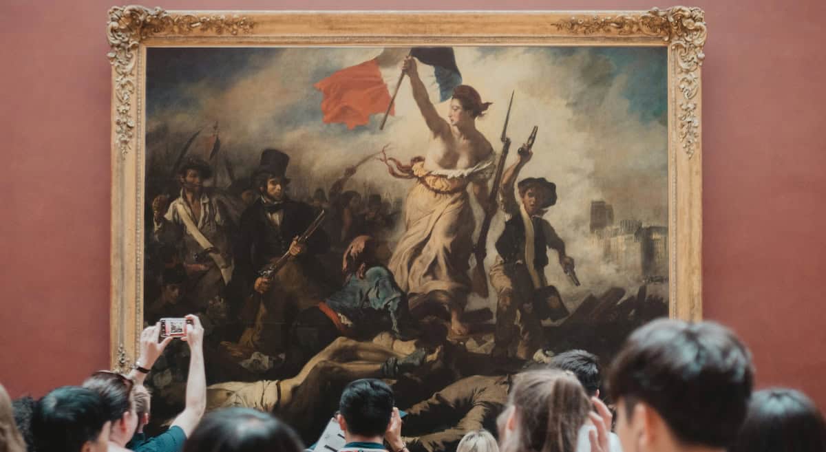 Des visiteurs internationaux prenant en photo le tableau La Liberté guidant le peuple (Delacroix) au Musée du Louvre - Photo de Jean Carlo Emer (Unsplash)